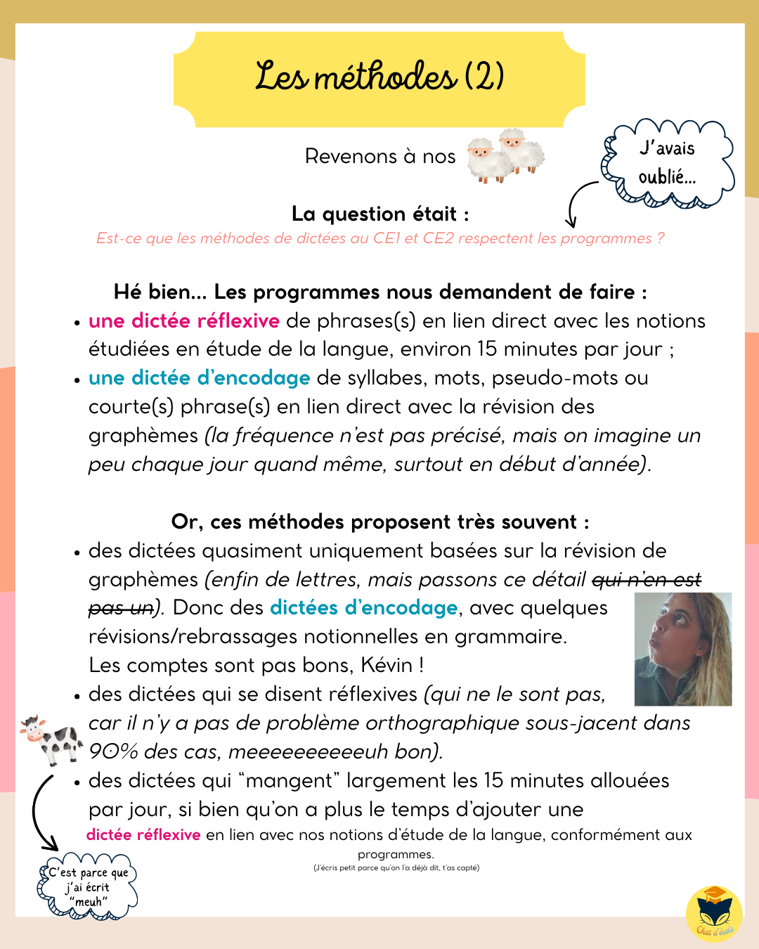Mais je le répète : c’est mon sujet d’étude du moment, parce que ce point est bloquant pour moi. Pour d’autres, il ne le sera pas, et ce n’est absolument pas grave. Et encore, j’ai été soft parce que j’ai une liste de « points bloquants » vachement plus longue ! L’absence de productions d’écrits, l’entrée par la lettre, l’orthographe graphémique qui est un terme purement et simplement inventé, pour ne pas les citer… Mais je m’égare ! 🤣