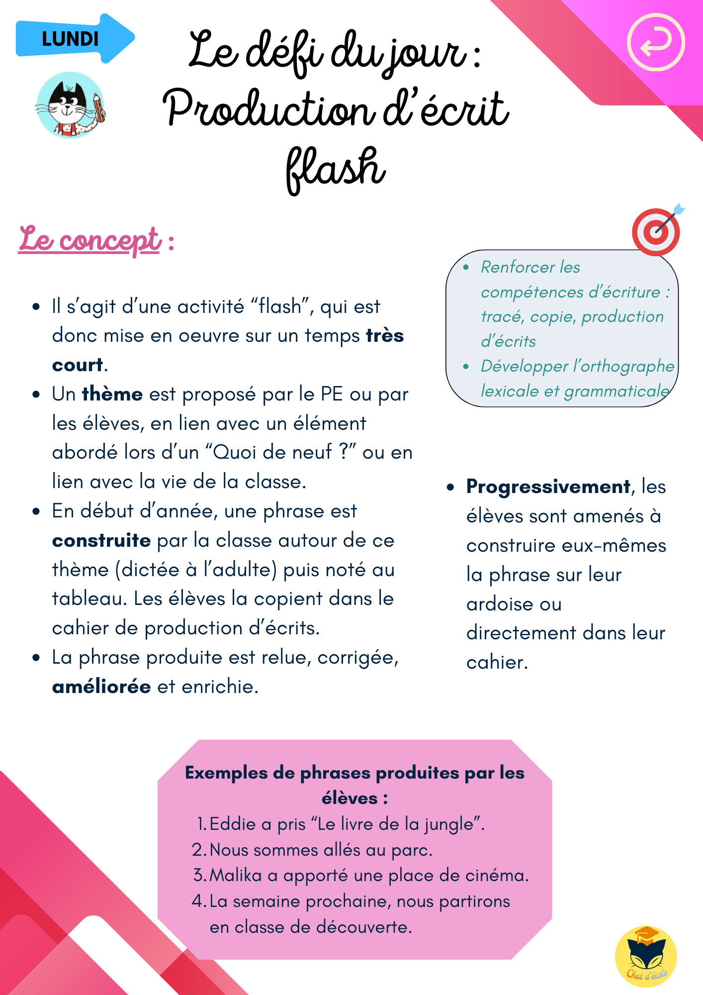 - une production d’écrit flash : une phrase construite collectivement, copiée, relue, corrigée et enrichie. Progressivement, les élèves écrivent seuls.