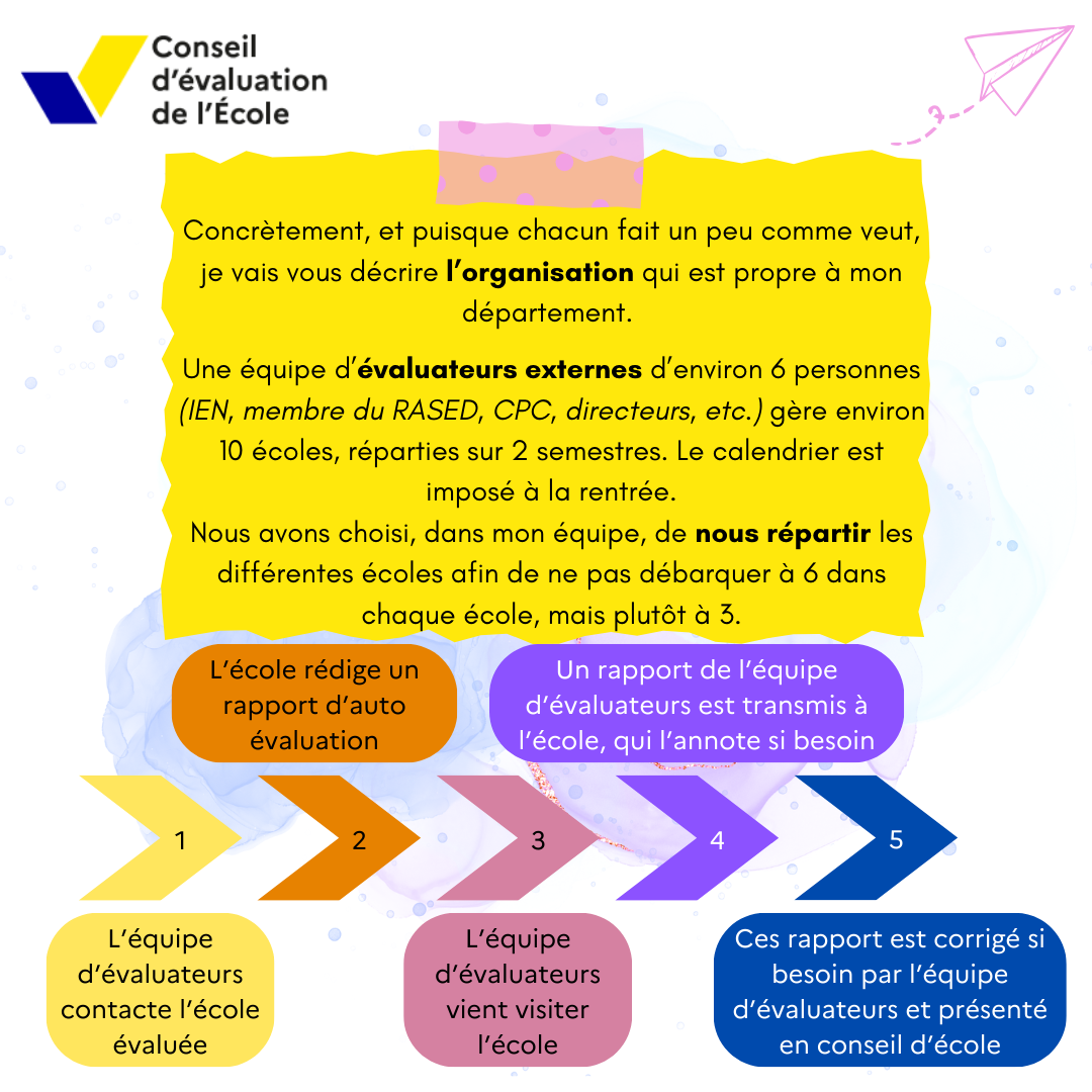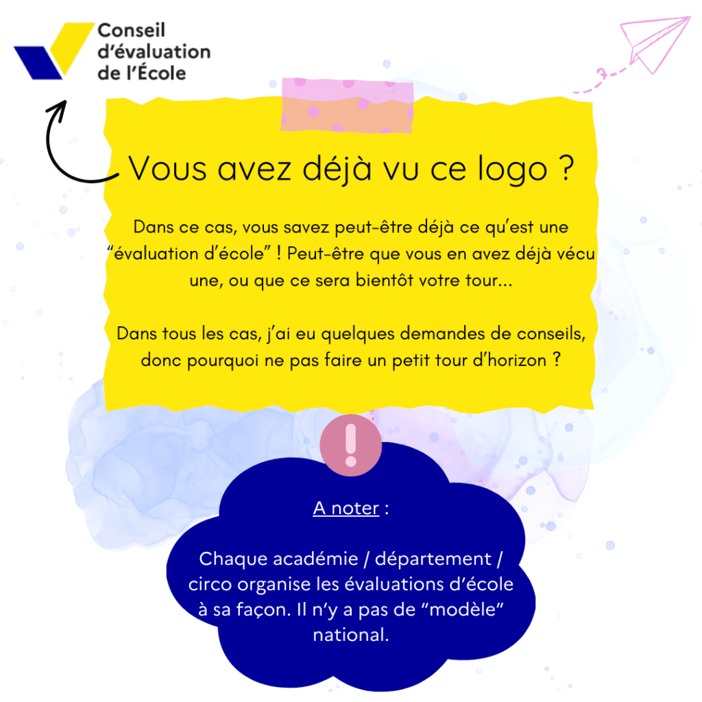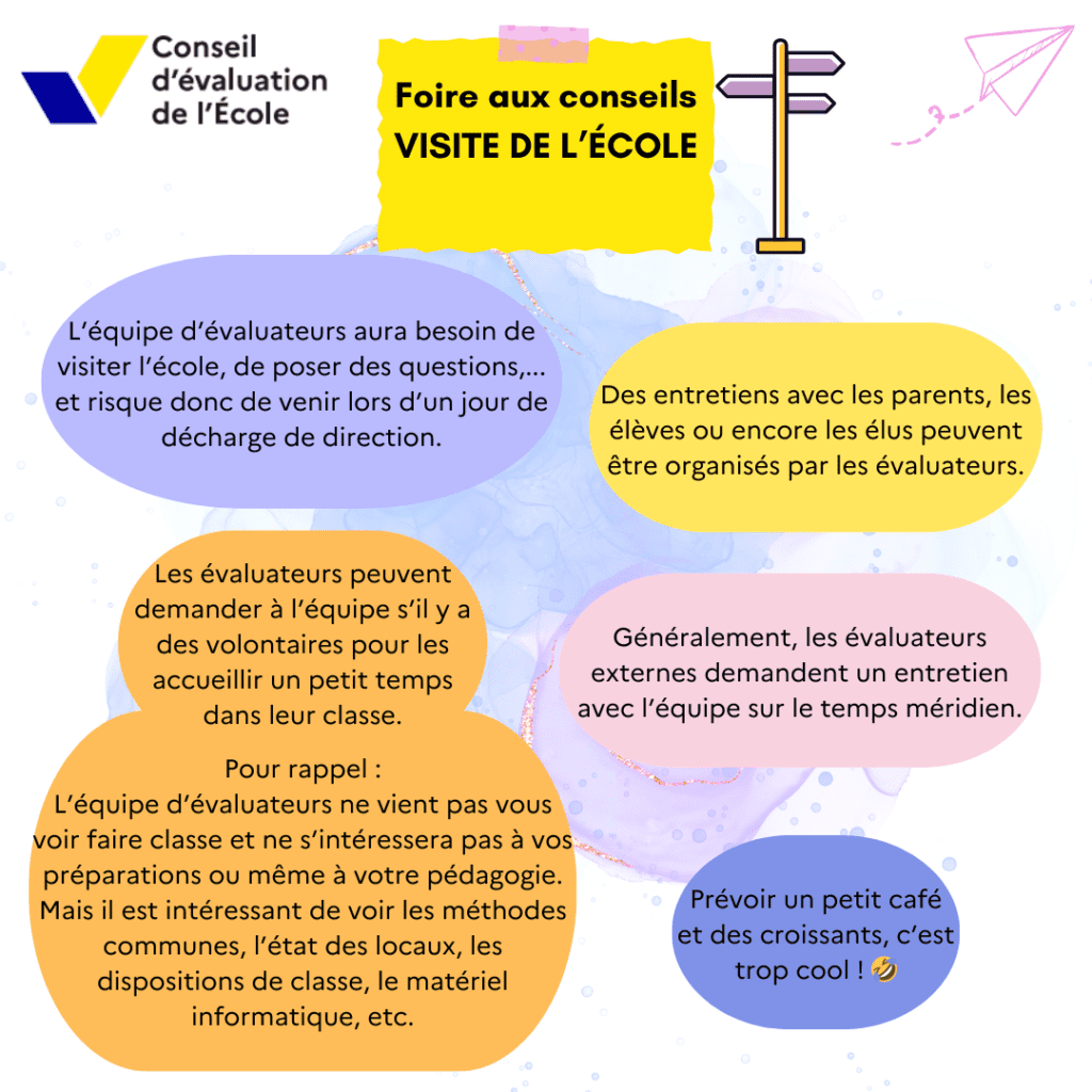Je vous propose quelques informationset conseils ci-dessous, qui j’espère, pourront être utilesaux collègues qui sont/seront en évaluation d’école.
