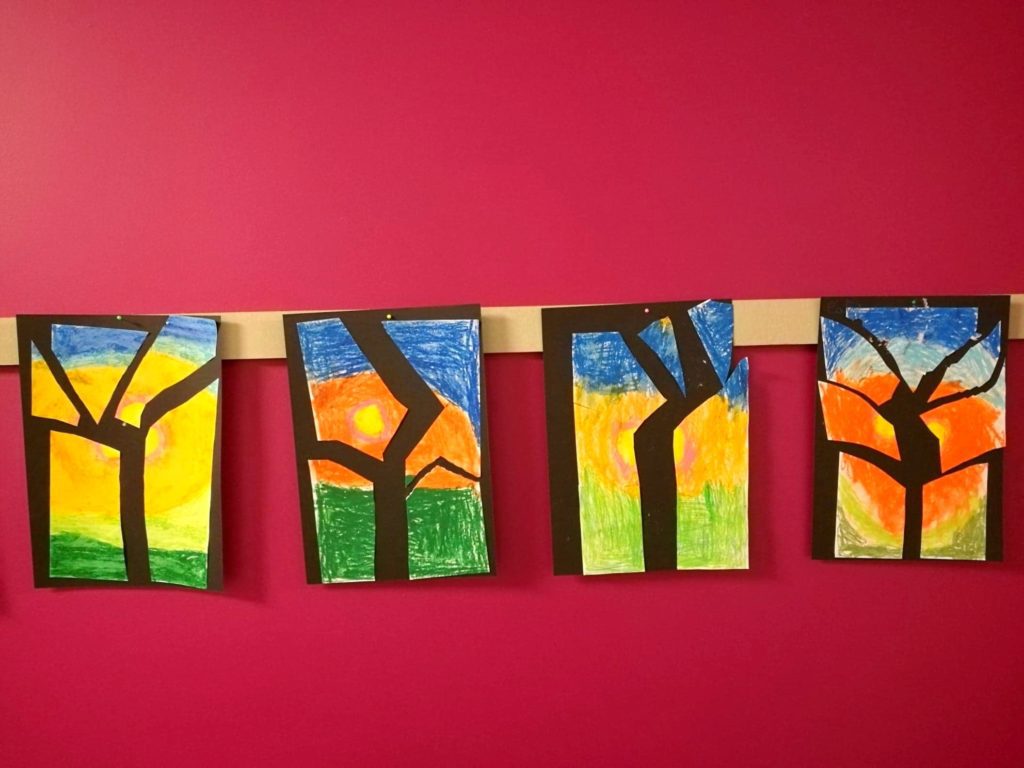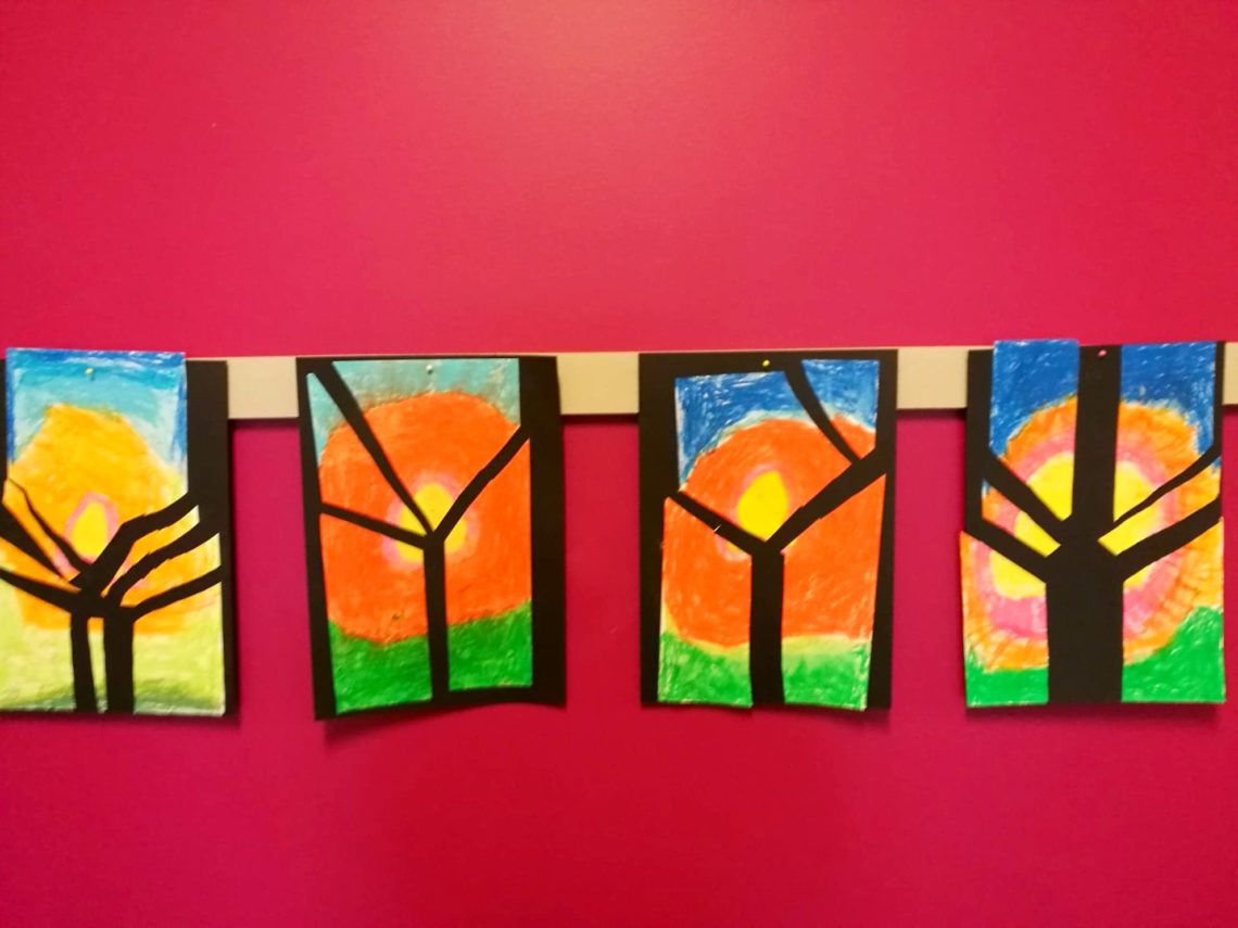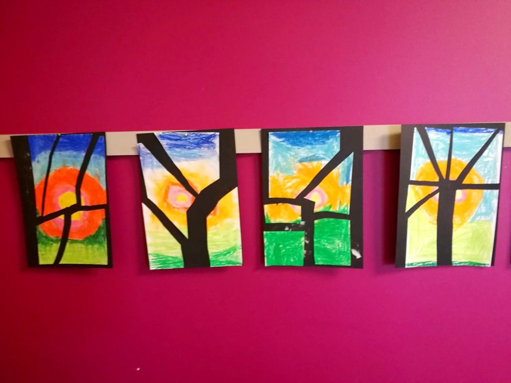 Au préalable de ce travail, nous avons étudié les couleurs : couleurs chaudes et froides, ainsi que les contrastes. Ici, nous mettons en pratique le contraste entre des couleurs vives et le noir.