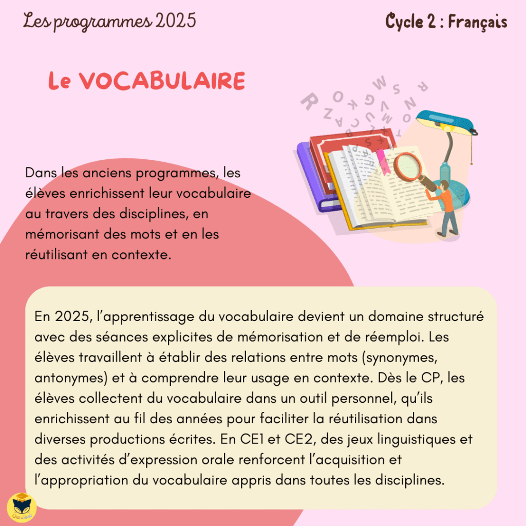 Pour les compétences de français, il y a quelques changements importants. Le document précise des éléments et apporte des repères par année. Le vocabulaire devient un domaine d’apprentissage à part entière, alors qu’il était auparavant avec la grammaire et l’orthographe en « étude de la langue ».