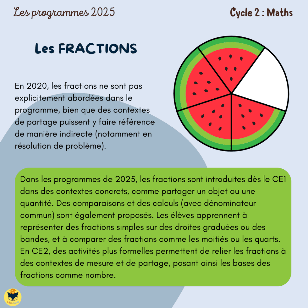 Pour les compétences de maths, il y a quelques changements importants. Le document précise des éléments et apporte des repères par année. On voit l’apparition des fractions dès l’année de CE1. Je trouve que cette initiation n’est pas complètement farfelue dès le cycle 2. A voir après ce que ça donnera concrètement dans les manuels ! Je suis curieuse de connaitre la façon dont ces notions seront amenées. Pour le reste, les changements me semblent minimes