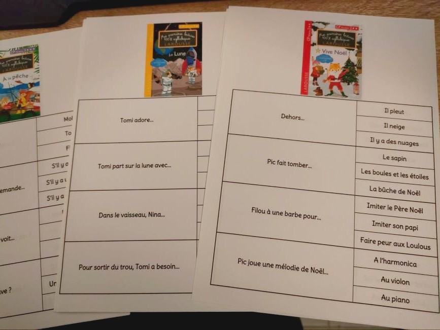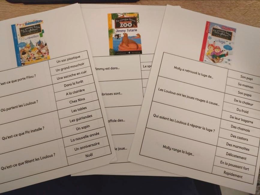 J’ai réalisé des fiches au format A5 (on peut même les imprimer en plus petit) à glisser dans chacun des livres. Après avoir lu le livre, les élèves doivent répondre à des questions de compréhension, ou terminer des phrases pour vérifier qu’ils ont bien lu et compris le texte. Pour cela, ils glissent un trombone ou une petite pince à linge en face de leur réponse (la correction est à noter au dos, avec un crayon de couleur jaune par exemple)