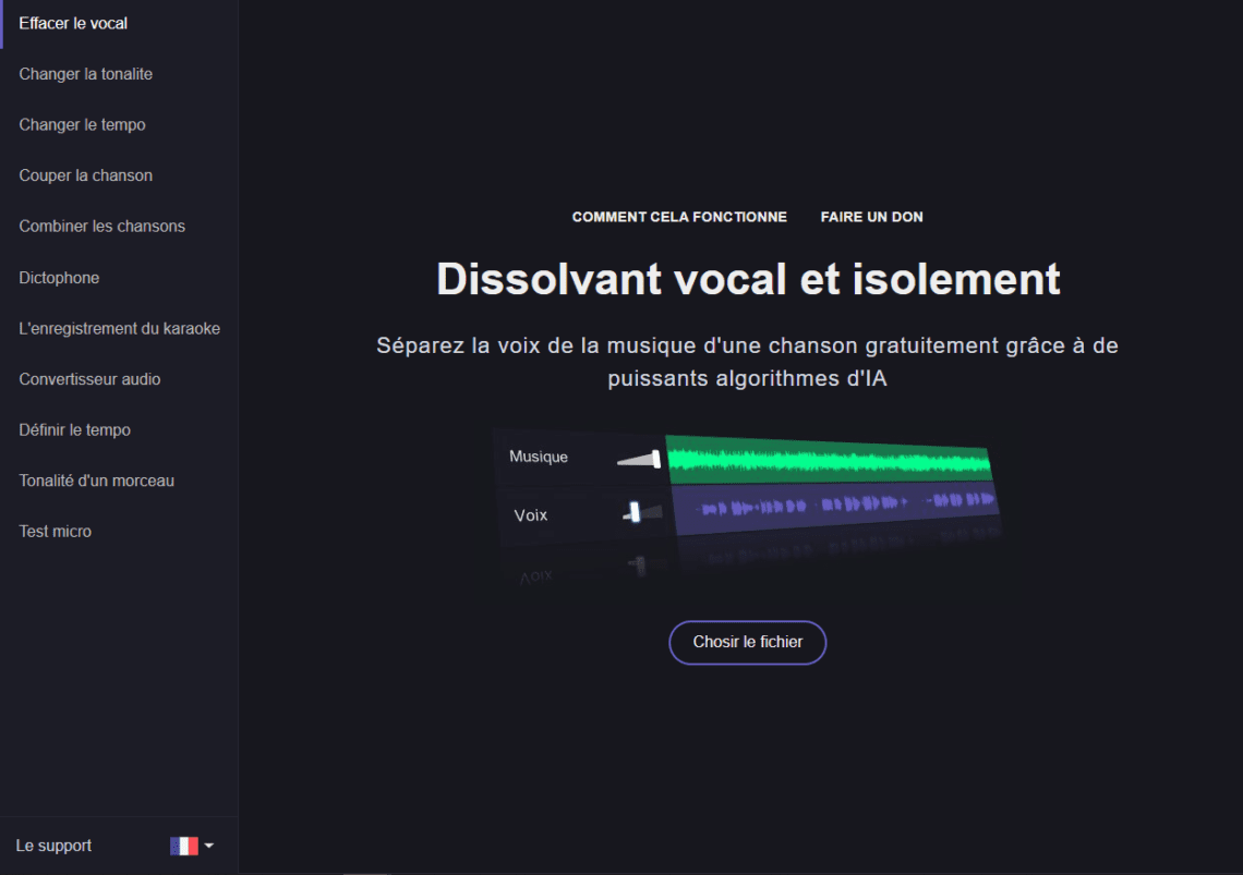 Le plus simple est d’utiliser Vocalremover. Un site qui permet d’effacerla musique OU la voix sur un morceau, en un seul clic !