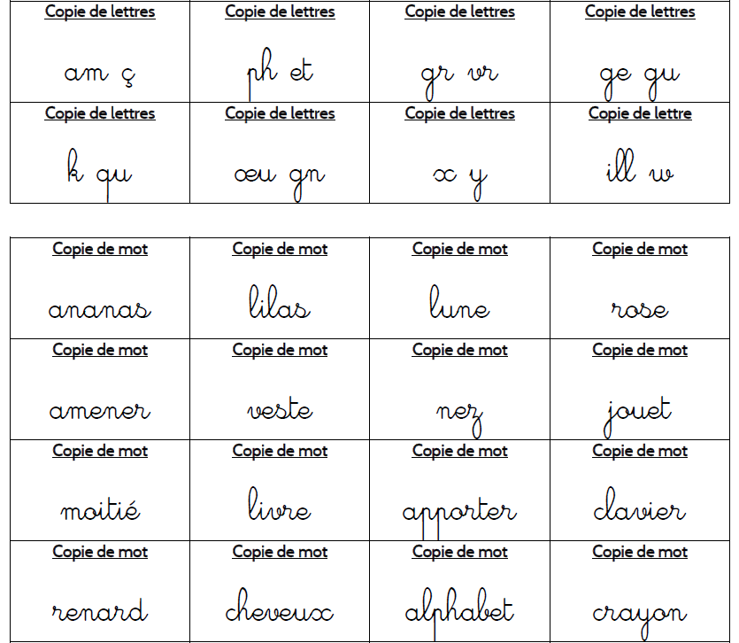 De rien. 🙂 C’est évolutif au fil de l’année pour les consignes : en début d’année, ils copient une lettre ou deux, puis un mot, puis une phrase. Le support visuel est obligatoire en copie, oui. Il s’agit de travailler l’observation du modèle, puis sa mémorisation et enfin sa reproduction à l’identique sur l’ardoise. 🙂