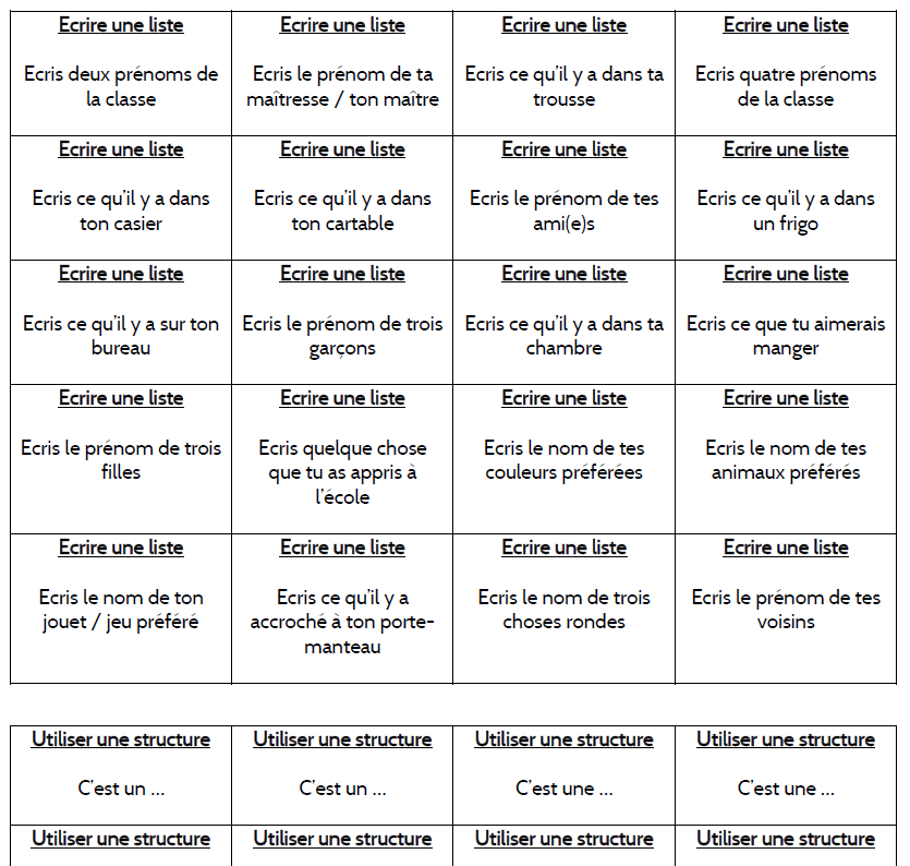 Sinon en production d’écrits, c’est simplement l’occasion de varier les types d’écrits. On fait des listes en classe également dès le début d’année, comme en vocabulaire dans la collecte de mots ou quand on liste des mots contenant un graphème. Chacun de ces moments peut être utilisé comme point de repère.