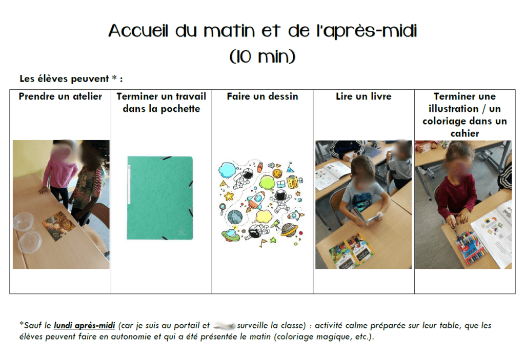 Certaines années, j’ai utilisé des rituels d’accueil divers et variés (appel, affichage du programme de la journée, etc.).