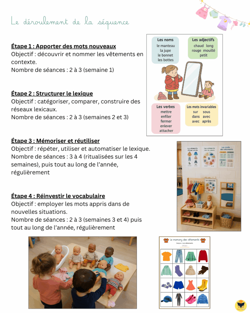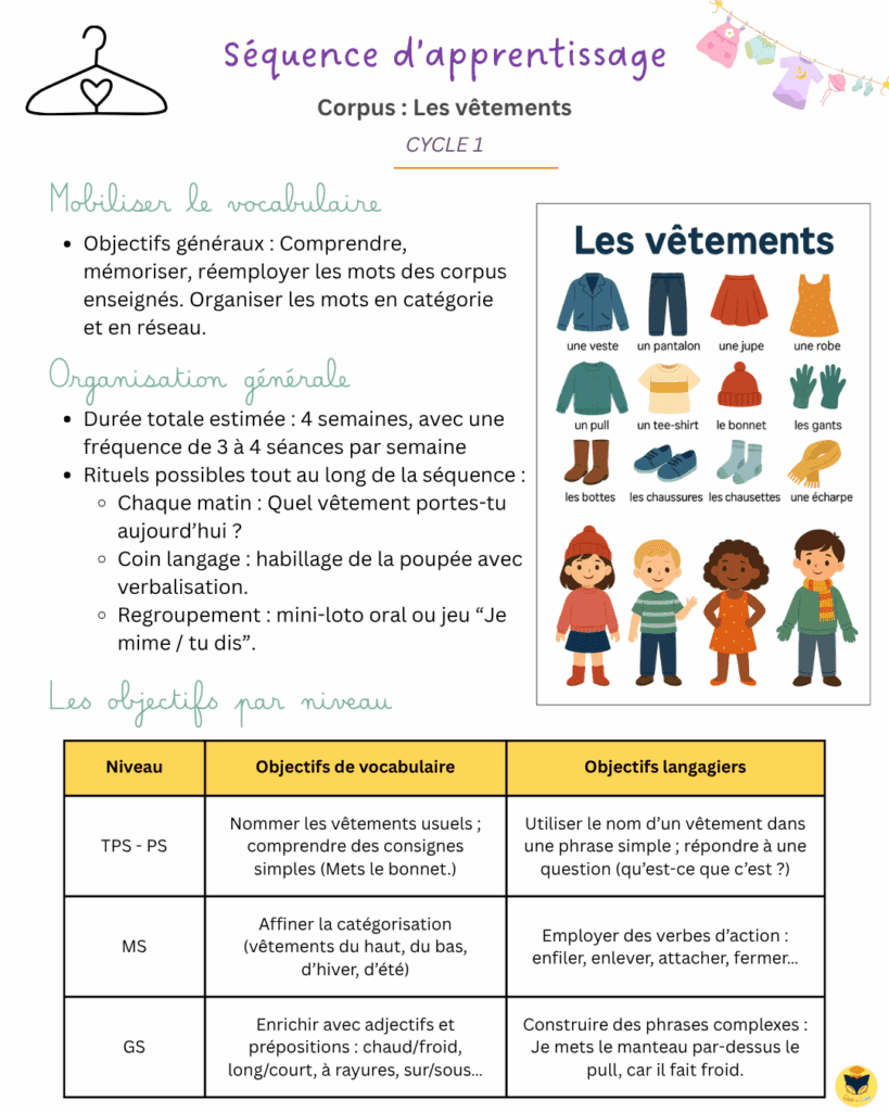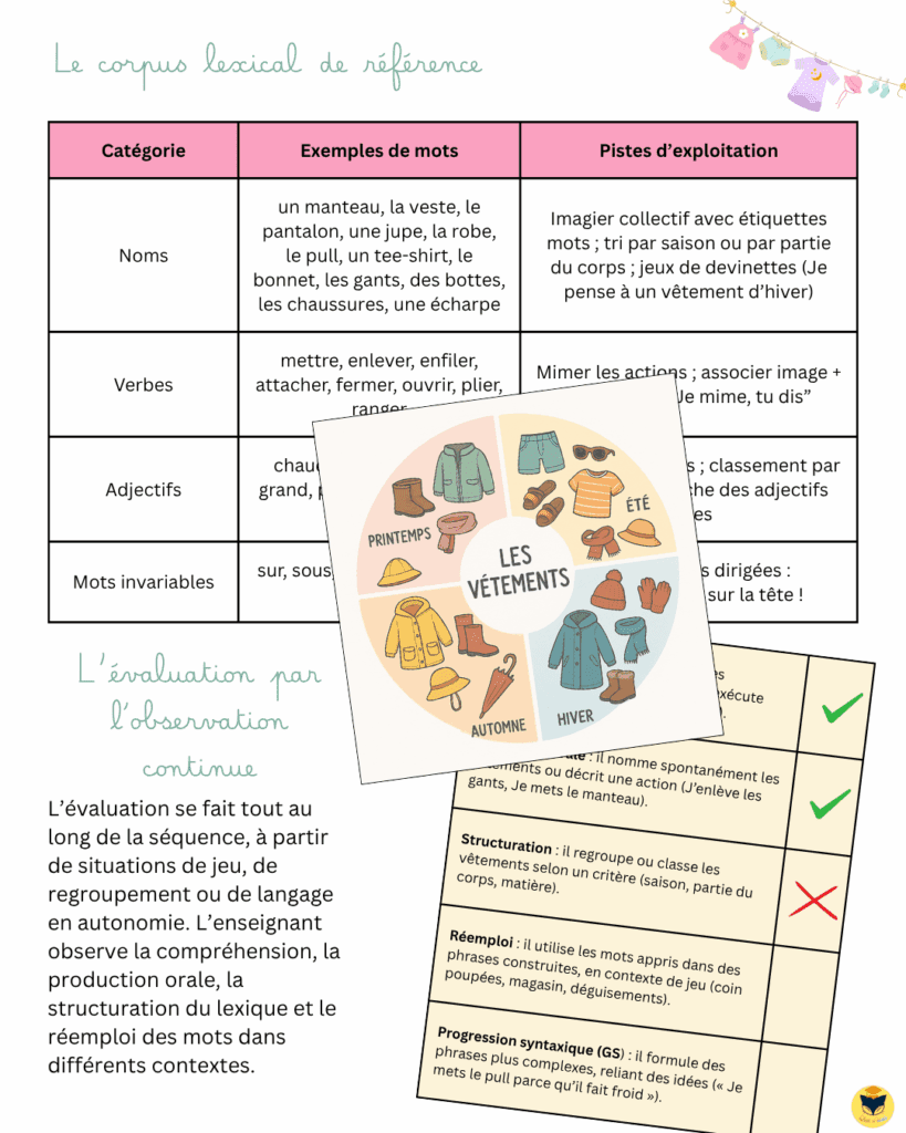 L’idée, c’est de couvrir un univers familier pour les élèves : les vêtements qu’ils portent, qu’ils enlèvent, qu’ils rangent, qu’ils adorent ou qu’ils détestent. On manipule, on nomme, on classe, on mime. 👍
