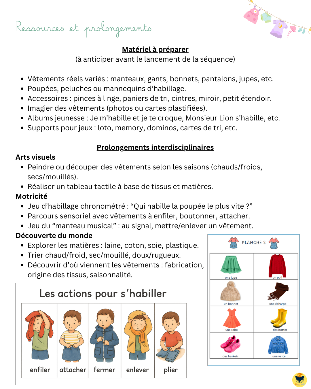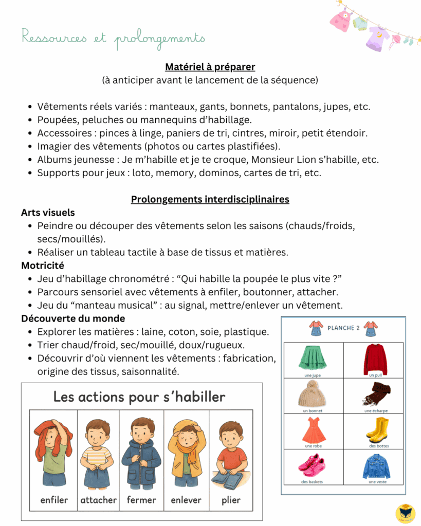 Cette séquence, vous vous en doutez, ce n’est pas juste « un mois sur les vêtements et puis on range tout ». Le vrai objectif, c’est de poser des bases solides pour que le lexique vive toute l’année : dans les coins jeux (poupées, déguisements, magasin), dans les rituels (« Quel vêtement portes-tu aujourd’hui ? »), dans les albums, dans les projets, en arts plastiques, etc. Bref, tout ce qui permet une mémorisation à long terme.