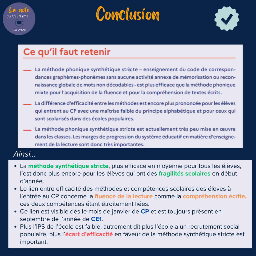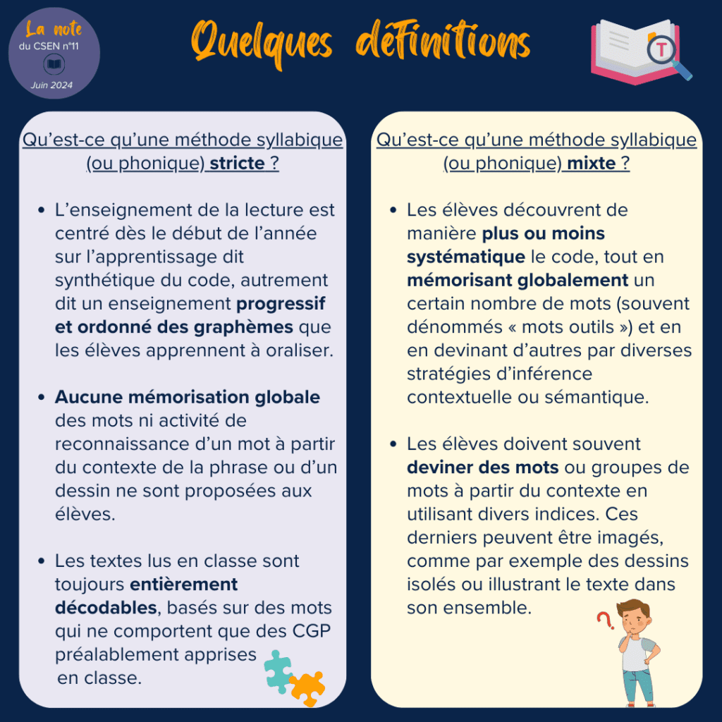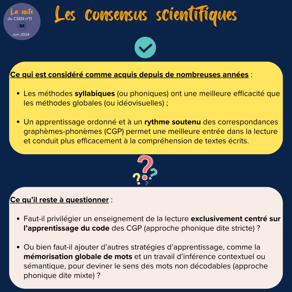 Cette note du Conseil Scientifique de l’Education Nationale, parue en juin 2024, porte sur l’efficacité des méthodes d’enseignement de la lecture au CP.