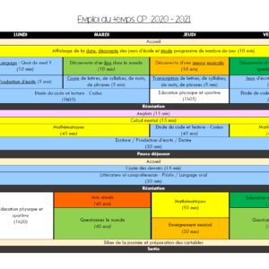 Bonjour ! Je vous avais proposé l’année dernière un emploi du temps CP – CE1. Voici l’emploi du temps version 2020 pour mes CP ! J’ai fait pas mal de modifications en Période 1, et il risque de beaucoup changer…