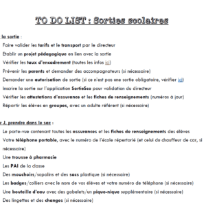 Bonjour ! Voici un petit document utile si vous partez en sortie scolaire avec votre classe. Il y a le point sur ce qu’on doit faire : Avant la sortie (préparation administrative) Le jour J, ce qu’il faut prendre dans le…