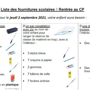 Bonjour, Voici la liste des fournitures scolaires pour les CP à la rentrée ! Rien de bien particulier, à part que nous demandons du petit matériel en plusieurs quantités (crayons de papier, colles, etc. pour faire une réserve en classe……
