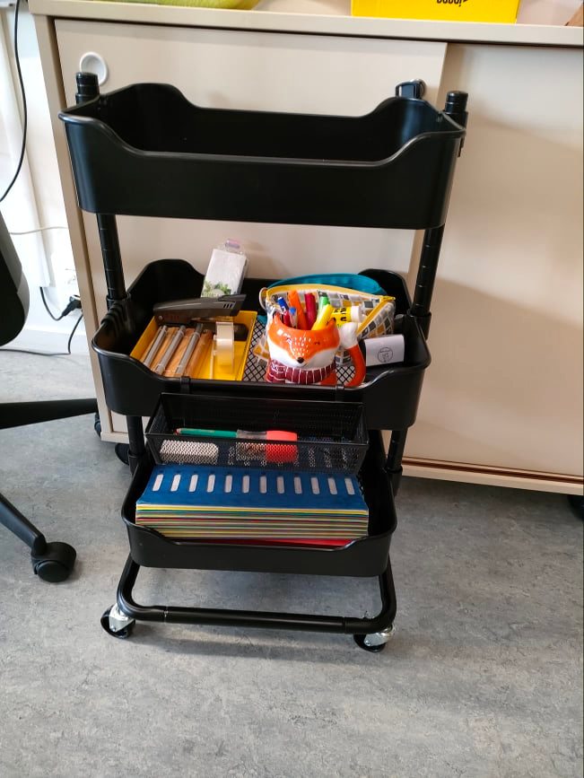 J’en ai choisi un à trois étages. Au RDC, je range mes documents administratifs car NON, je n’ai pas de bureau. Cette chose me fera donc office de bureau sur roulettes !