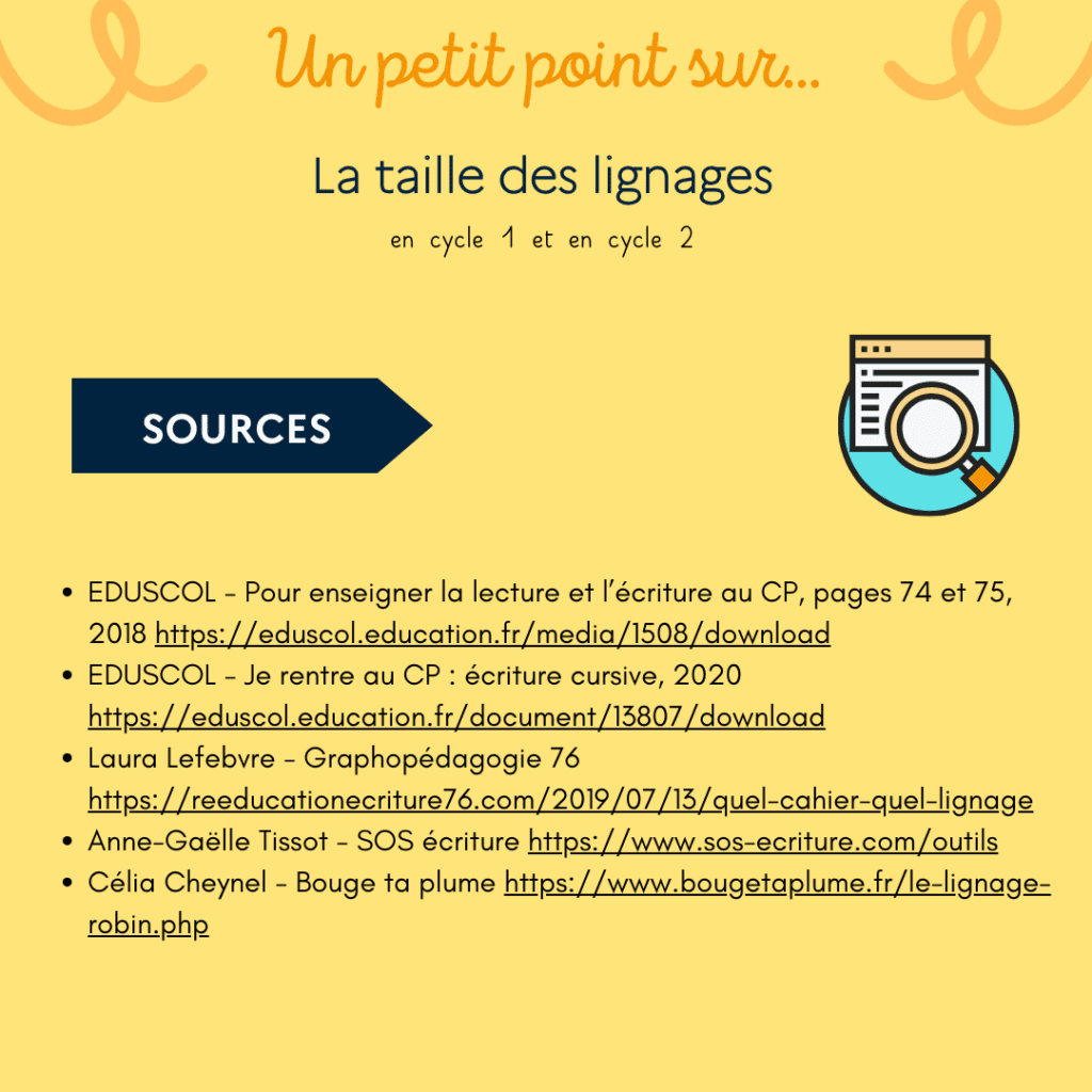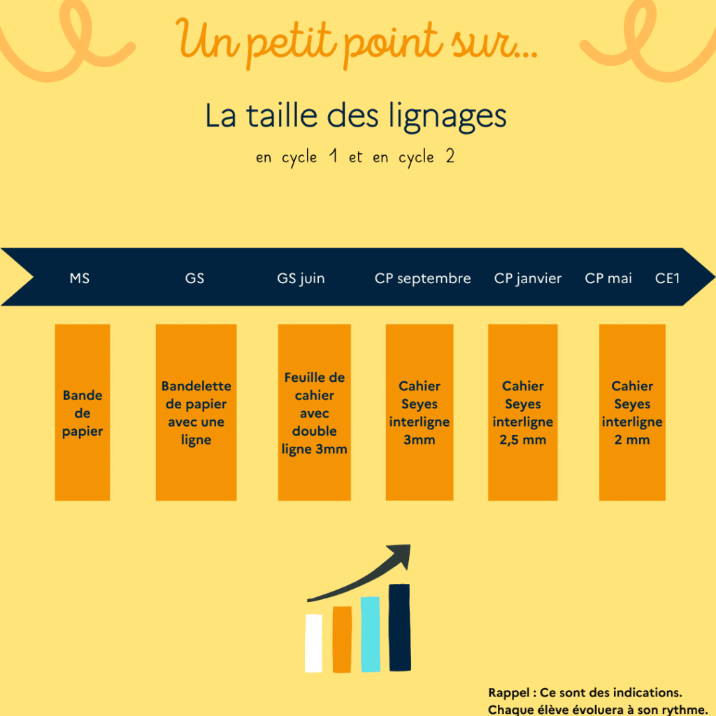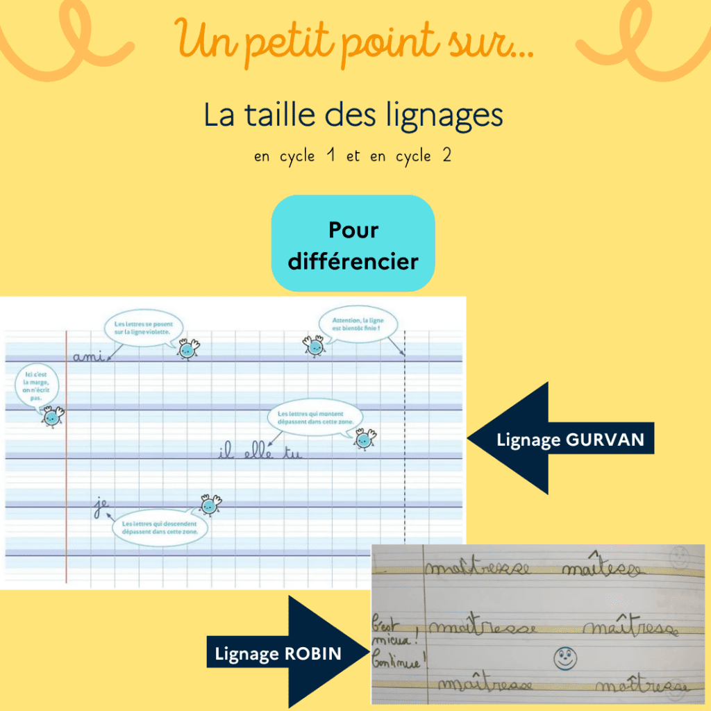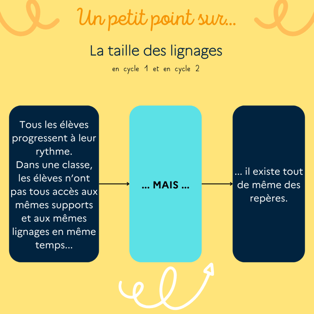 🔎 Dans mon propos, je cherchais avant tout à créer avec les collègues une logique de continuité et d’harmonisation sur les deux cycles en français : quels ductus communs, quels supports, quels outils scripteurs, etc. La question de la taille des lignages s’est donc naturellement posée : « Mais au fait, qu’est-ce que mes collègues de GS, de CP ou encore de CE1 utilisent comme lignage dans leur classe ? »