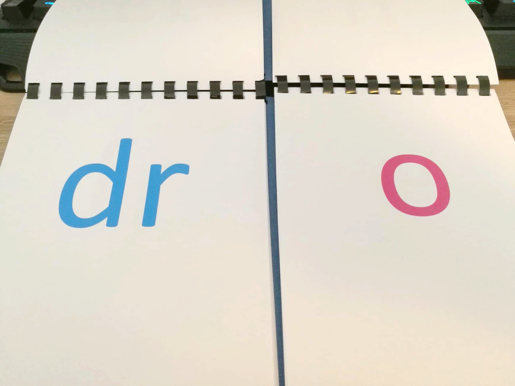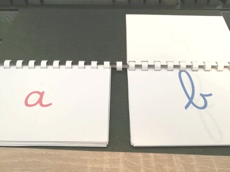 Au fur et à mesure de nos découvertes des sons j’enrichis le carnet. J’écris au feutre les graphèmes correspondants à notre leçon (avec un système de couleur bleu=consonne, rouge=voyelle, vert=sons complexes types au, en, ou, on, oi…). Je demande aux élèves de « préparer la bonne page ». Je n’ai plus qu’à circuler dans les rangs pour écrire la lettre, c’est rapide. Le carnet est toujours dans le cartable pour lire les syllabes à la maison et nous l’utilisons également en classe. Je leur demande de créer une syllabe et ils tournent les pages. J’aime bien leur faire faire cet exercice en binôme également. Parfois je prends un carnet, je tourne les pages et les élèves doivent la lire ou me faire les gestes associés.