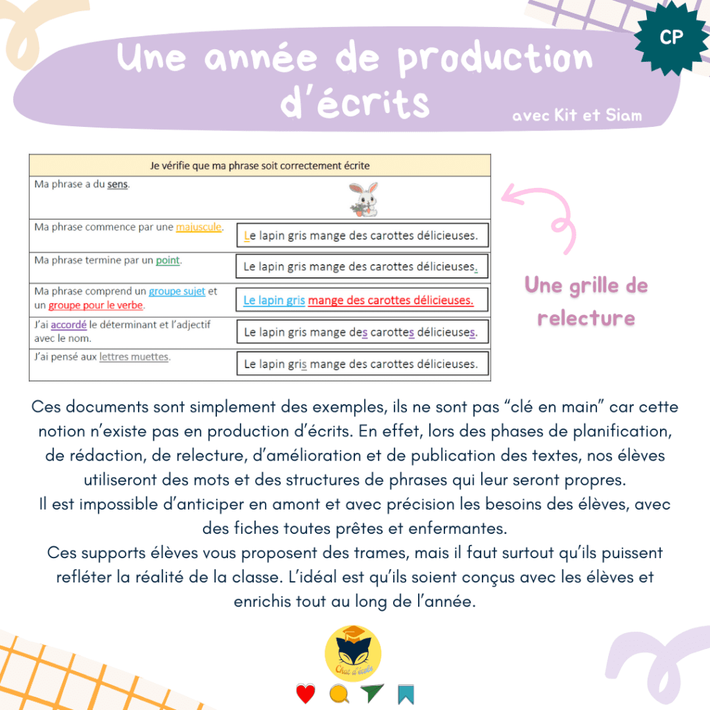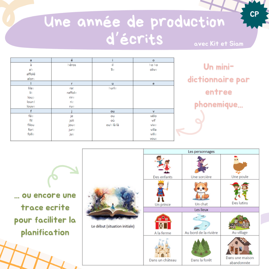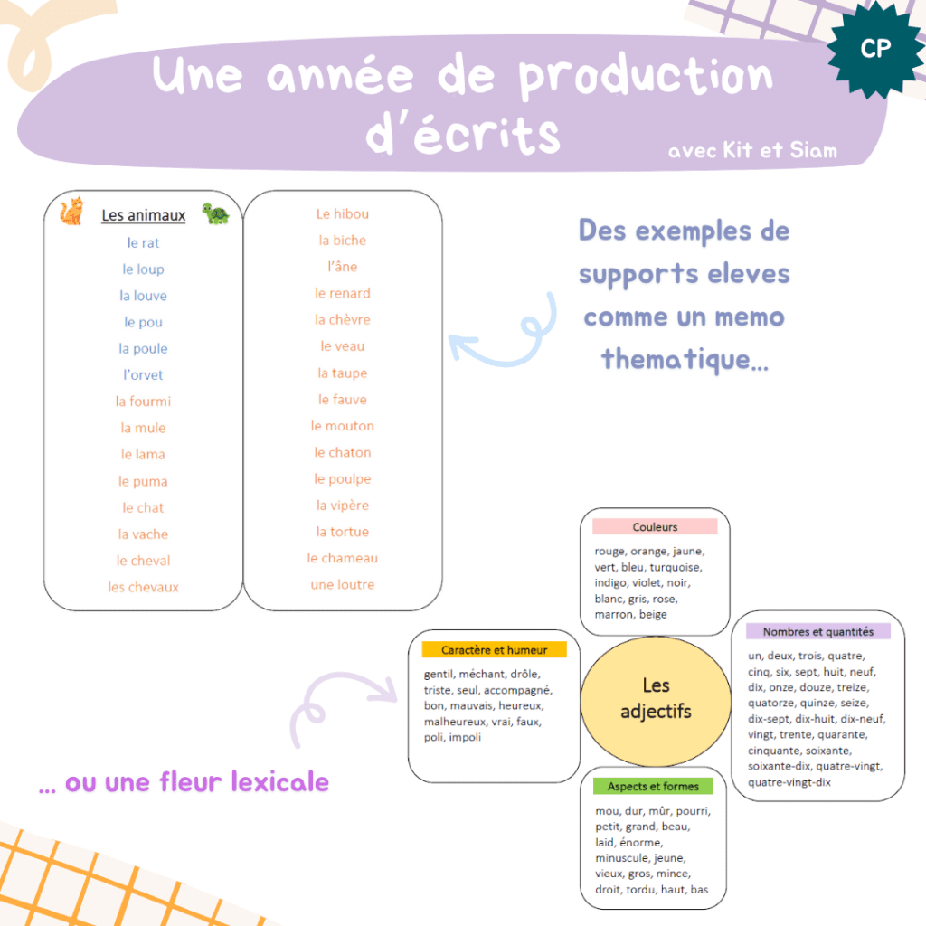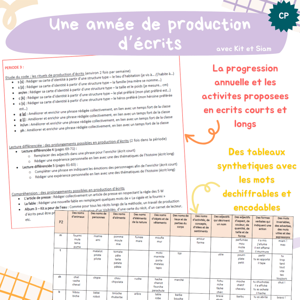 Vous trouverez en bas de cet article un fichier d’accompagnement en production d’écrits, qui suit ma méthode de français au CP « Kit et Siam ». Ce fichier comprend :